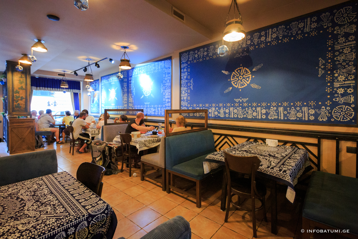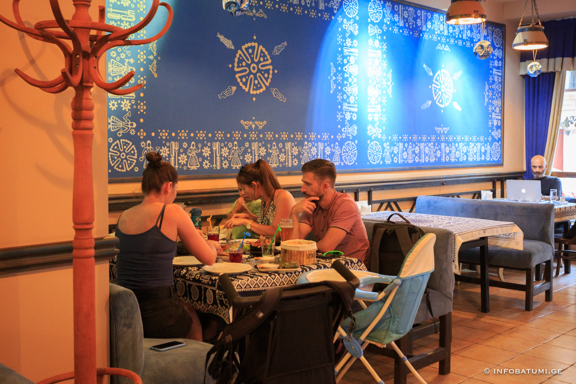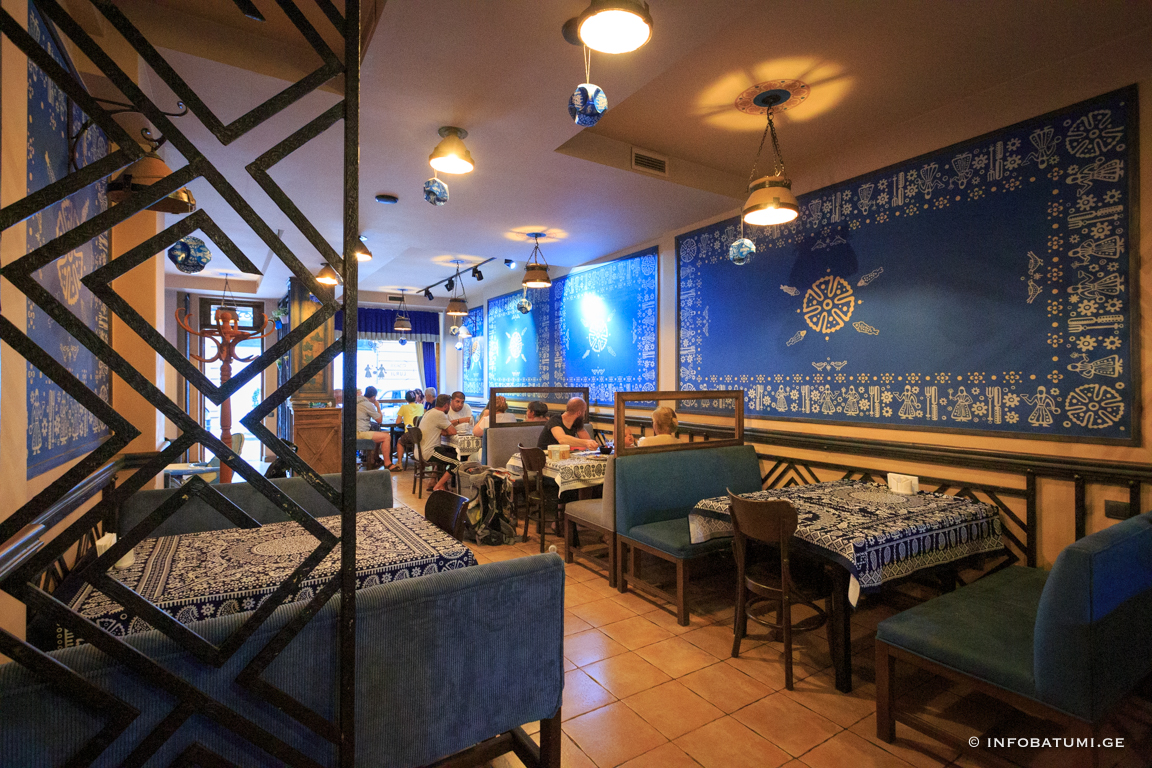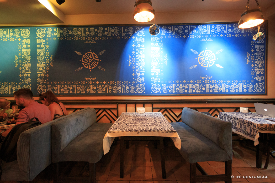 In such traditional elements of artistic ornament as astral and plant motifs, zoomorphic and anthropomorphic faces, the ideas related to the ancient worldview of the Georgian people are reflected in their own way. Among the household motifs of the blue table, it is worth noting the table attributes: knife, fork, spoon, as well as images of dancing men and mandilosas dressed in Georgian dress and chokha-akhalukh.
