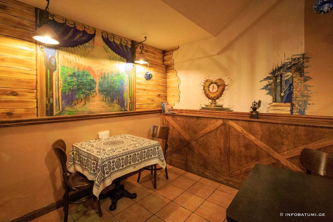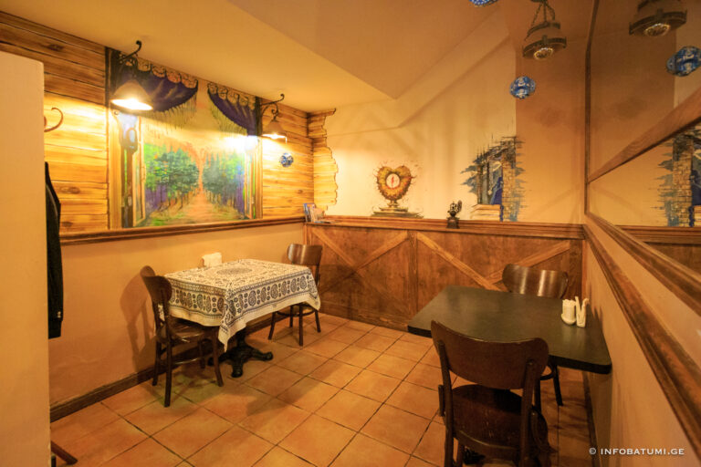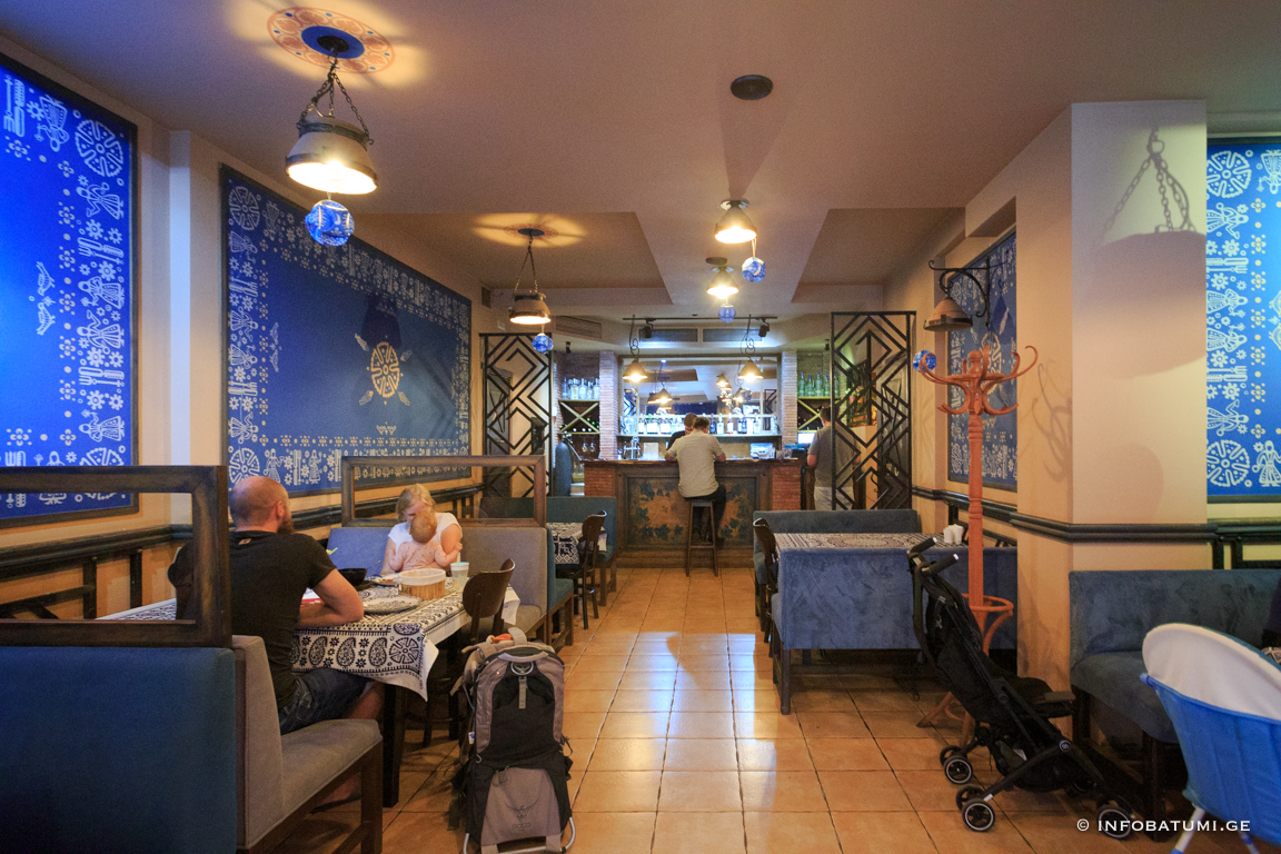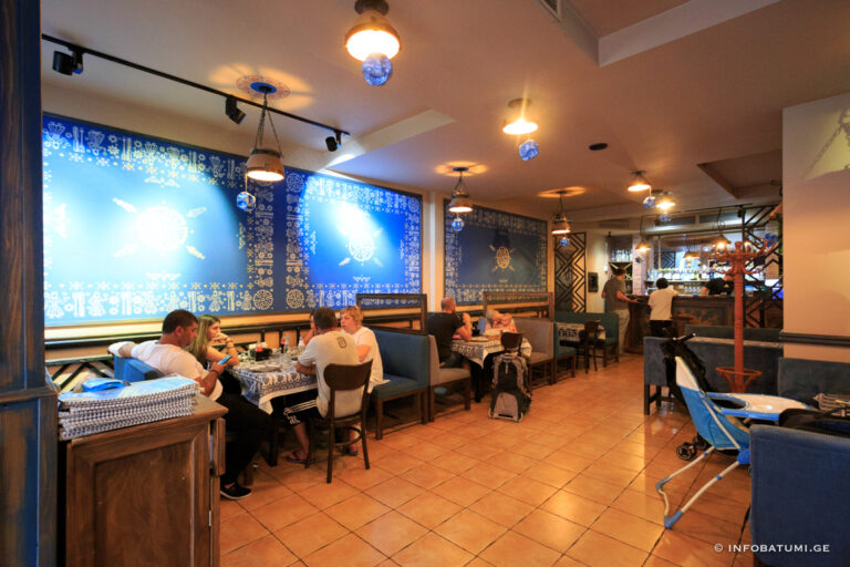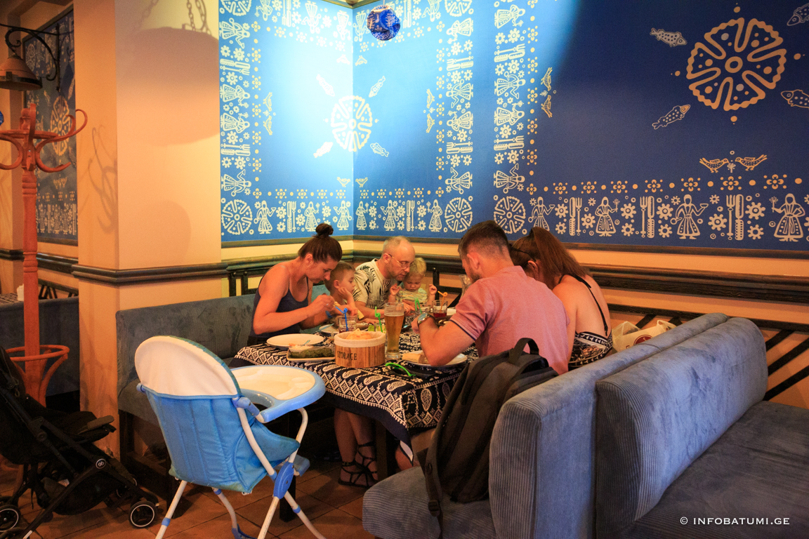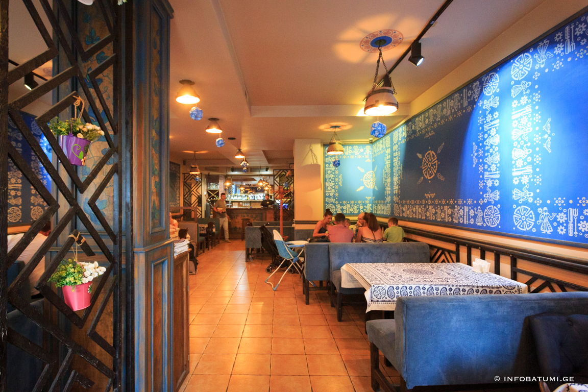 In such traditional elements of artistic ornament as astral and plant motifs, zoomorphic and anthropomorphic faces, the ideas related to the ancient worldview of the Georgian people are reflected in their own way. Among the household motifs of the blue table, it is worth noting the table attributes: knife, fork, spoon, as well as images of dancing men and mandilosas dressed in Georgian dress and chokha-akhalukh.