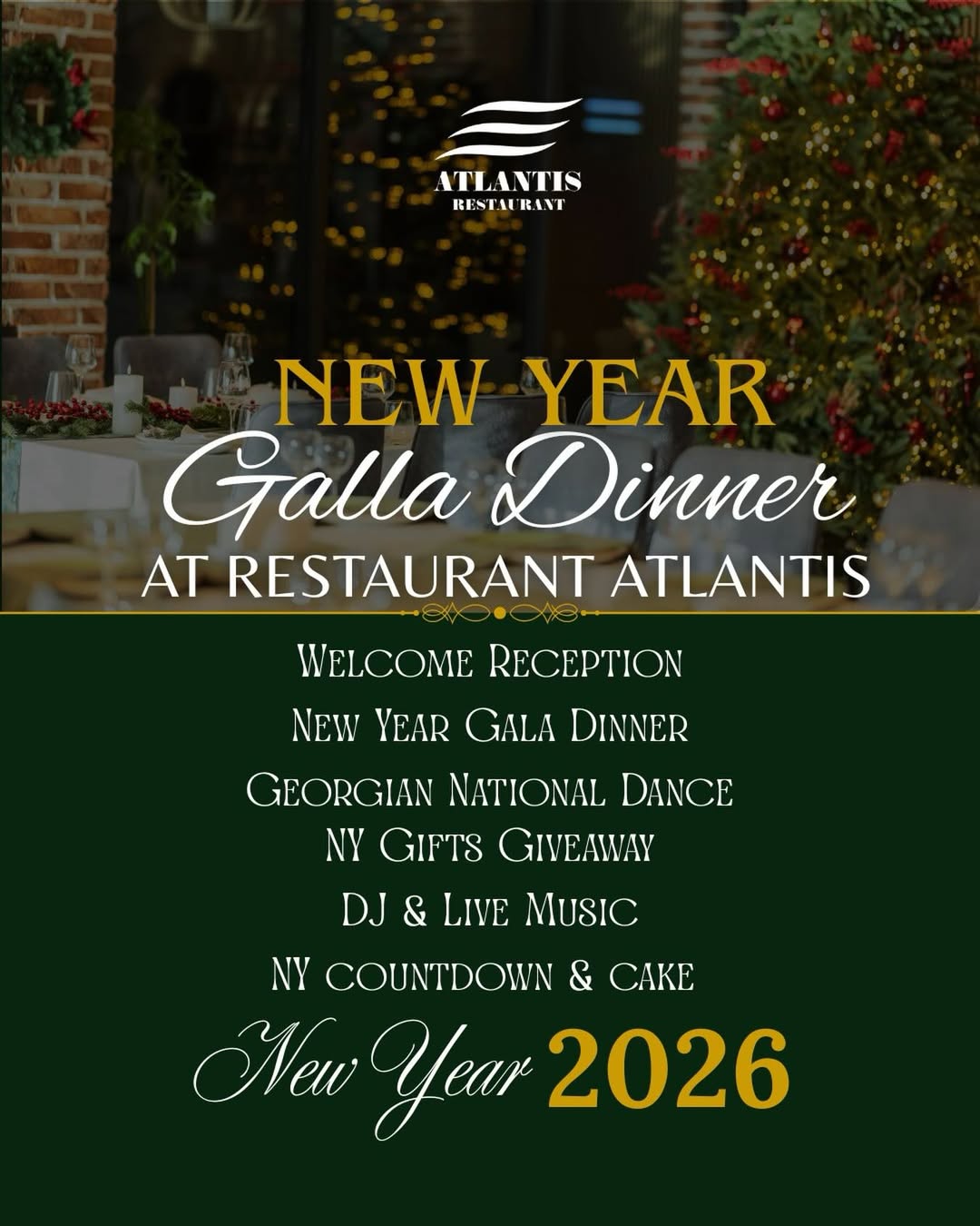 შეხვდით 2026 წელს ელეგანტურ გარემოში, გალა ვახშმით, ცოცხალი მუსიკით და განსაკუთრებული სადღესასწაულო ატმოსფეროთი.