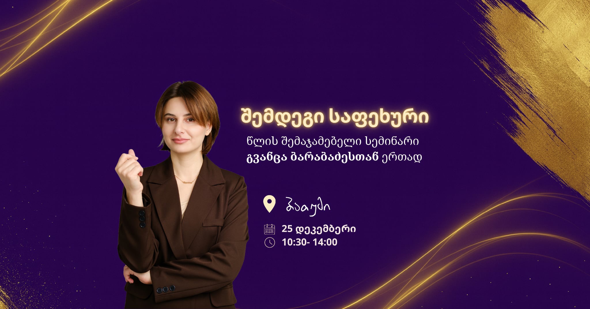 ეს სემინარი გაძლევს შესაძლებლობას მოხვდე გარემოში, რომელიც მოგცემს მეტ სიცხადეს და დაგეხმარება მომავალ წელს შეხვდე ენერგიით, რომელიც მოგიტანს ახალ შედეგებს.