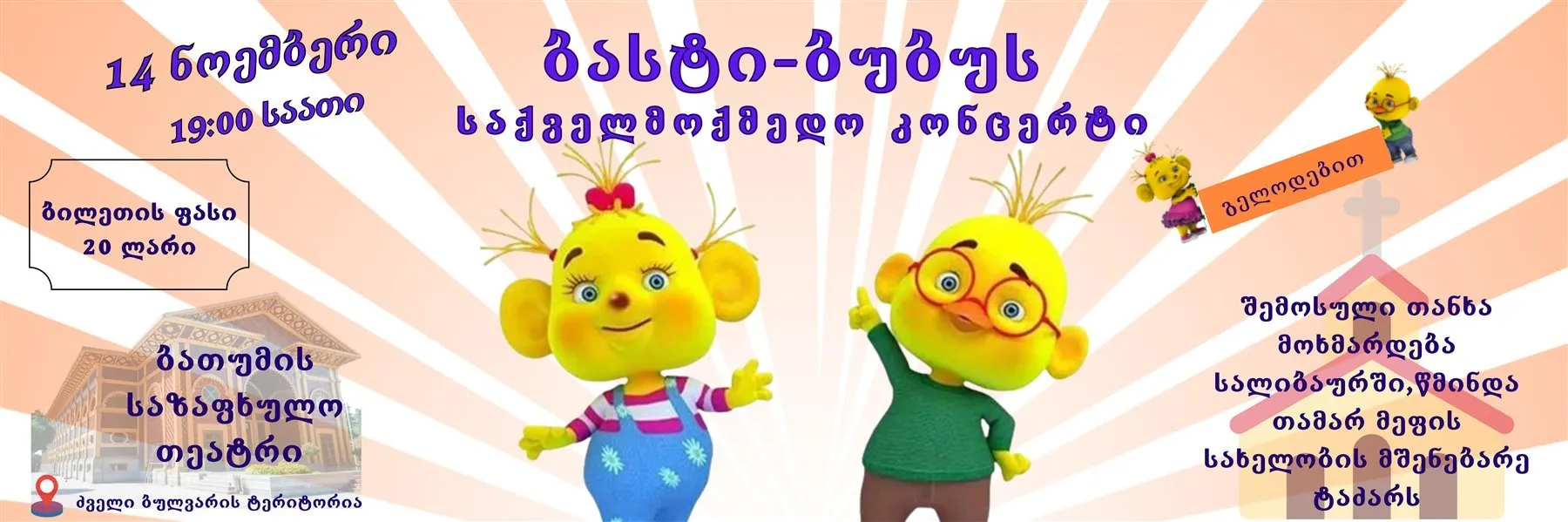 Любимец всех детей Басти Бубу ждёт вас на концерте, полном веселья и радости, где прозвучат известные музыкальные номера в исполнении самых талантливых детей. Малыши получат заряд позитива, а родители совершит путешествие в детство.